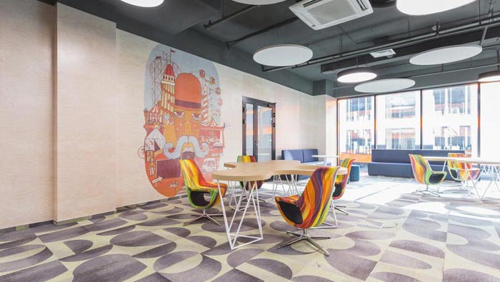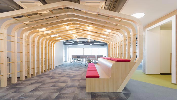 過道結合部的設計:此處為整個企業的內部交匯點,在此處過道呈四面八方式分布,不管走哪一個方向都可以繞回原地,這也是一個大回型動線設計,故此設計師在設計中在此地開辟出一片如凈土般的區域,以軟裝進行鋪墊,讓員工、客戶在此處可以休息、娛樂,可增可減的沙包型座椅,也在無形中成為一處亮點。