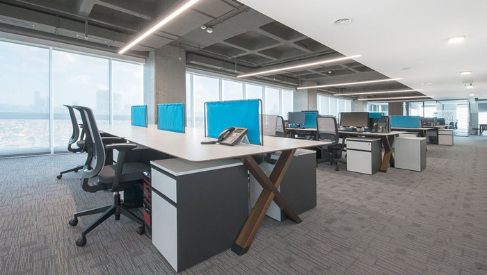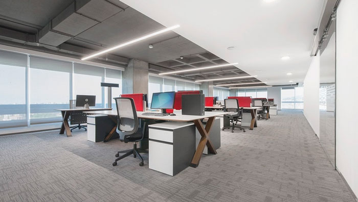 辦公區(qū)域的設計:設計師在打造辦公室的同時,也在強調(diào)室內(nèi)與室外之間的聯(lián)動,在設計師看來復雜的金融對于每一位員工來說,長期都會讓人感到心力交瘁,這也是極簡設計受歡迎的原因,因為簡單的空間本身就擁有抵消復雜的效果,一線江景的引入也是為了給員工營造一個輕松、舒適的辦公空間。