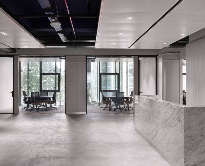 在該項目中,人力行政部門位于一樓;技術部門位于二、三樓。會議室和休閑區也根據需要布置在每一層。整體空間的白色調用于營造寬敞的氛圍。天花板被漆成深藍色,同時使用灰色調的技術設備,提供統一性。會議室和行政室的家具、柜臺以及儲藏室均采用定制,而開放式工作區則采用標準辦公家具。