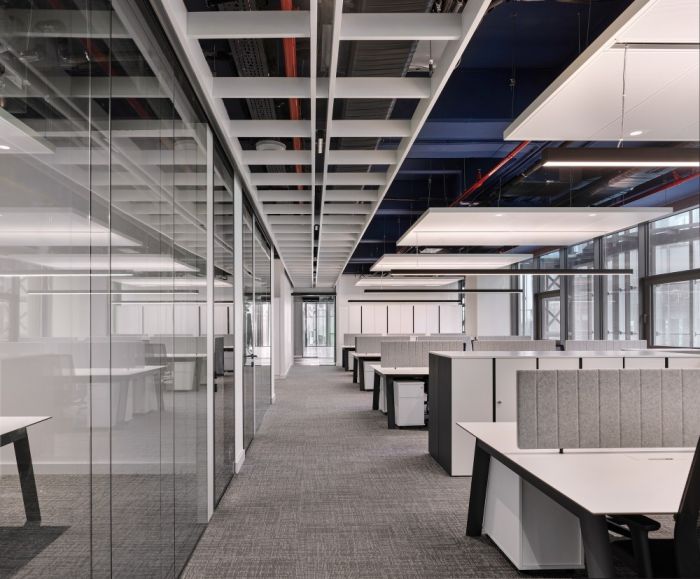 這是一個金融行業的辦公室,在這個3200方的辦公室中,公司在不同領域的相關部門被設計在一起,而工作空間則以線性規劃方案布置。