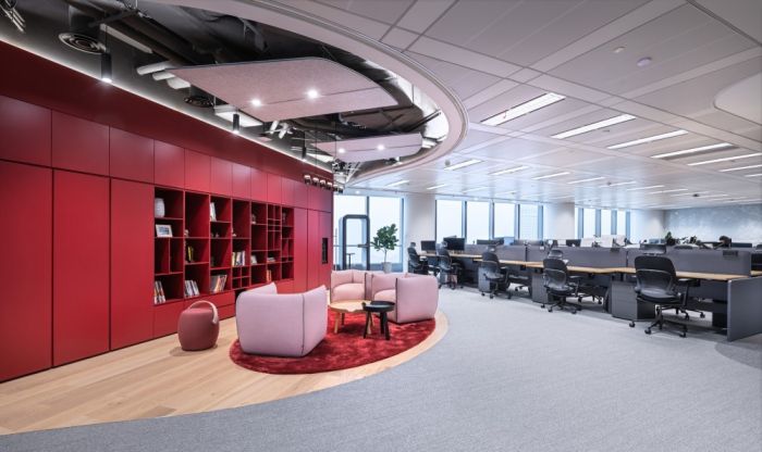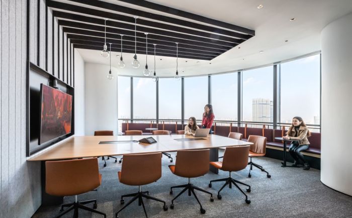 辦公室采用多種類型和形式的燈光,包括地面、吊燈和桌面燈光,以呈現明亮、充滿活力的工作文化。辦公室還運用了中國傳統文化元素,如靈感來源于中國古代故事的地面和家具設計,以及以中國農歷年為靈感的室內裝飾。 辦公室還強調了與本地社區的聯系,通過標志、裝飾和環境藝術作品等方式運用了中國傳統文化的符號、顏色和字體。此外,辦公室還注重環境友好和員工福利,包括提供全景視野的餐廳和社交區域,以及可調節高度的辦公桌。