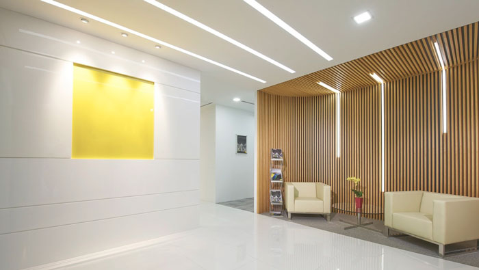 進(jìn)門區(qū)域的設(shè)計(jì):設(shè)計(jì)師在設(shè)計(jì)的時(shí)候,考慮到金融辦公室裝修的特性,并考慮到辦公現(xiàn)場(chǎng)的現(xiàn)狀,故此采用去前臺(tái)的設(shè)計(jì)手法,并在空間的斜對(duì)面加入了接待區(qū)域,這樣做的目的就是為了協(xié)調(diào)與前臺(tái)之間的關(guān)系,當(dāng)客戶進(jìn)入空間之后,整個(gè)空間呈夾角分布,指明了進(jìn)入空間的路徑。