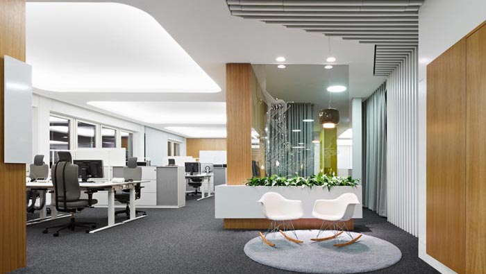 辦公區域的設計:設計師在設計的時候,在采用開放式辦公的同時,以儲存柜代替隔斷將每一個辦公工位進行隔離,在設計師看來這樣的設計可以有效的彌補開放式的缺點,同時讓空間看起來更加有層次感,儲藏柜的設置也很好的解決了空間容納的缺憾,真是一舉兩得。