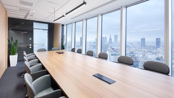 會議室的設計:此處給人的第一感覺就是視野非常寬敞,這也是設計師特意為之,在設計師看來會議本身要解決的,就是企業在發展過程中遇到的各種問題,故此大局觀十分重要,此次會議室可同時滿足24人參加會議,在這里設計師將室內空間與室外空間相互交融在一起,讓人仿佛置身于自然中一般,以此提升大家的大局觀念。