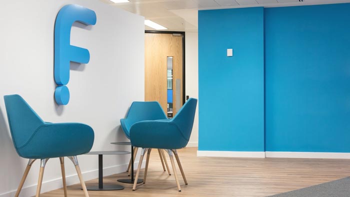 進門區(qū)域的設計:設計師在設計的時候,考慮到空間的實際情況與企業(yè)的需求,最后決定采用去前臺的設計手法,一來這樣可以符合空間的實際情況,避免對空間造成更大的浪費,二來也是為了辦公室的精簡,此處設計師僅僅采用企業(yè)logo和接待椅就完成了對進門區(qū)域的設計,也展現(xiàn)出設計的魅力。