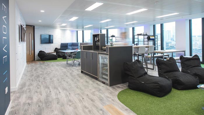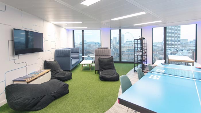 休息區(qū)域的設計:映入我們眼簾的是一篇草坪,在這里員工可以直接席地而坐,在這里沒有那么多的規(guī)矩,在這里員工們是自由的,設計師希望給員工營造一個自由、開放、舒適的空間,讓員工在這里可以玩耍、閱讀,以此放松身心。