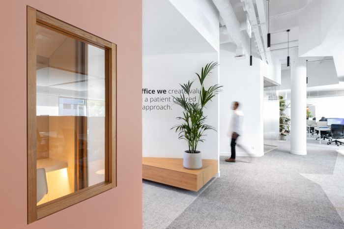 這是一個(gè)700方的辦公室,業(yè)主是一家從事醫(yī)藥行業(yè)的公司。設(shè)計(jì)師把工作區(qū)分為三個(gè)區(qū)域:一個(gè)安靜的區(qū)域,員工可以進(jìn)行個(gè)人工作;一個(gè)動(dòng)態(tài)區(qū)域,員工可以單獨(dú)工作或者與同事互動(dòng);以及一個(gè)協(xié)作區(qū)域,團(tuán)隊(duì)可以在這里進(jìn)行會議,進(jìn)行團(tuán)隊(duì)討論。