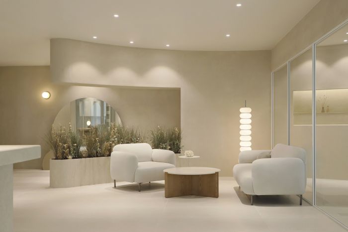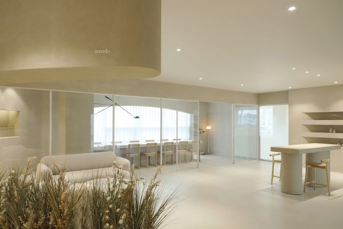 這是一個化妝品品牌的公司辦公室,有500方的面積。設計師希望這個辦公室成為表達品牌的調性和品牌核心價值的空間。設計師創造了一個優雅的空間,整體設計使用曲線表達了品牌形象。