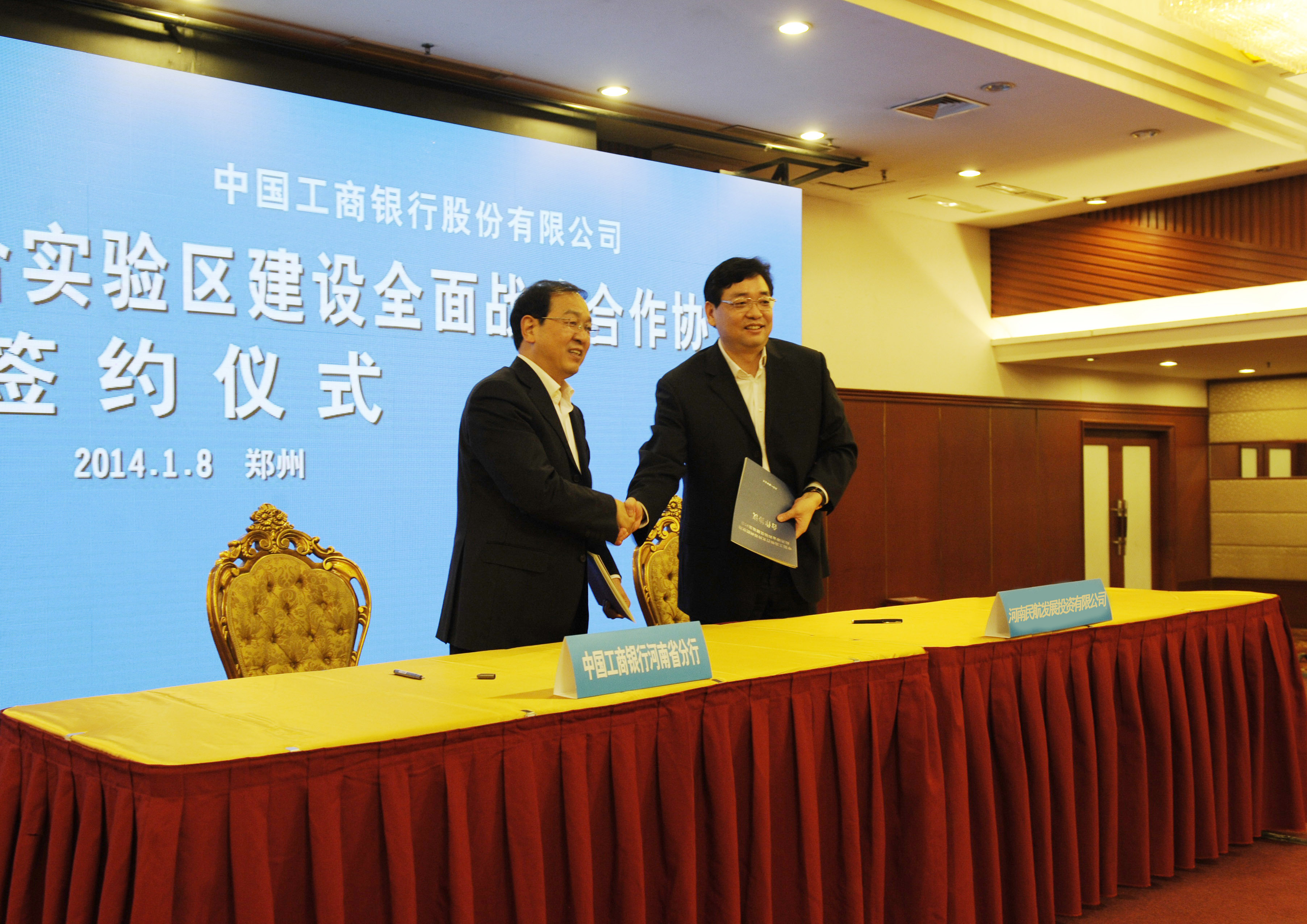 On January 8, 2013, Mr. Xie Fuzhan, the governor of Henan province met Mr. Yi Huiman, the president of ICBC. Representing the government of Henan and ICBC respectively, they signed the comprehensive strategic cooperation agreement for building Zhengzhou Airport Comprehensive Economic Experimental Zone. Mr. Li Ke, the vice-governor of Henan province was present at the meeting and hosted the ceremony. Since HNCA was one of the main entities in the Zone, Mr. Zhang Mingchao, the Chairman of HNCA, attended the ceremony and signed the bank-enterprise cooperation agreement with ICBC on behalf of HNCA.