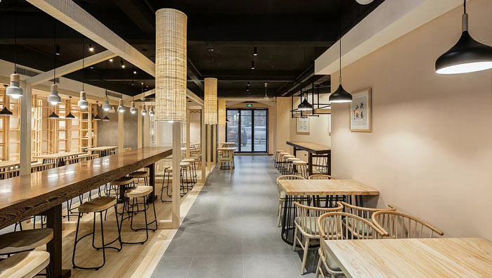 特色面館大眾區設計:超長的餐桌、獨立的餐椅讓空間的容納能力進一步提升,空間的容納能力提升但卻并不顯得擁擠,這是設計師為每個人都預留了足夠的活動空間。