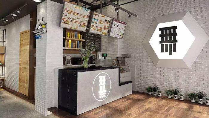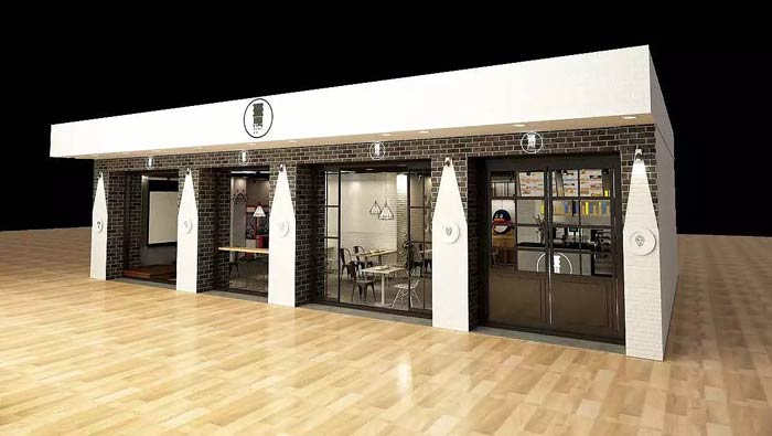 茶飲茶餐廳外立面設計:白色的屋頂加上黑色的logo設計,在空間中十分醒目,門、透明窗戶兩邊都由白色的鉛筆狀組成,整個空間的格局井然有序,讓整個空間簡潔、明朗。