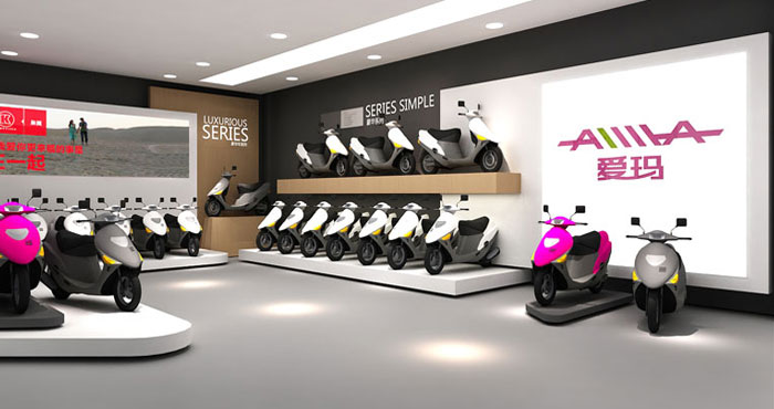 設計理念:設計師在設計之初,首先考慮到就是顧客見到店面的第一感覺。因為顧客進到店面之后第一眼看到的就是電動車烤漆的顏色,這樣就會直接影響到顧客的第一眼感覺。設計師在設計的時候都會盡最大的努力把顏色作為重要的考慮。把顏色盡最大化的展現出來,讓白天陽光照射下來之后,會感覺到漆面顏色亮麗出彩,這樣就可以盡最大努力的讓用戶來的第一眼就對店面有一個很直觀的看法,可以贏得用戶的好印象。