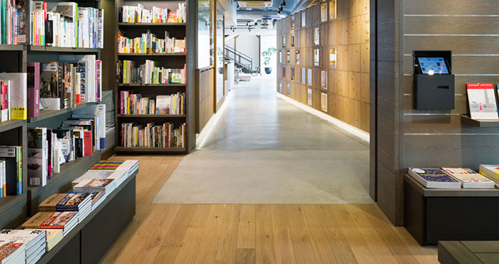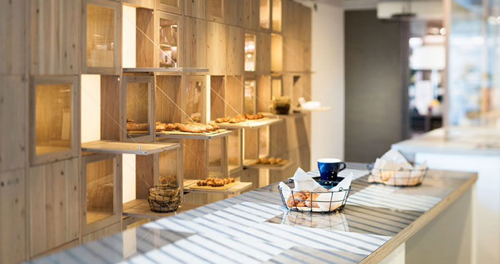 設計理念:店內色調素雅,以木質材料為主,簡約且現代化。選擇開放式的廚房,表現出所有的面包糕點都是新鮮出爐。天花板直接將設備管線裸露,各類風格迥異的吊燈設計也透露一股現代工業氣。提供了三種不同類型的座位:吧臺型、公共長桌型和榻榻米風格的坐席,供顧客自由選擇。設計了一個類似集裝箱的展示平臺,為了展示不同類型的點心,希望鼓勵通過這個平臺讓顧客發現自己想吃什么最值得一提的是,這家簡約風格的糕點店,特意為顧客設計了一塊閱讀區域,就像圖書館一樣,提供各類書籍。在享受美味的同時還能豐富精神食糧,這樣的小店雅致,美好!