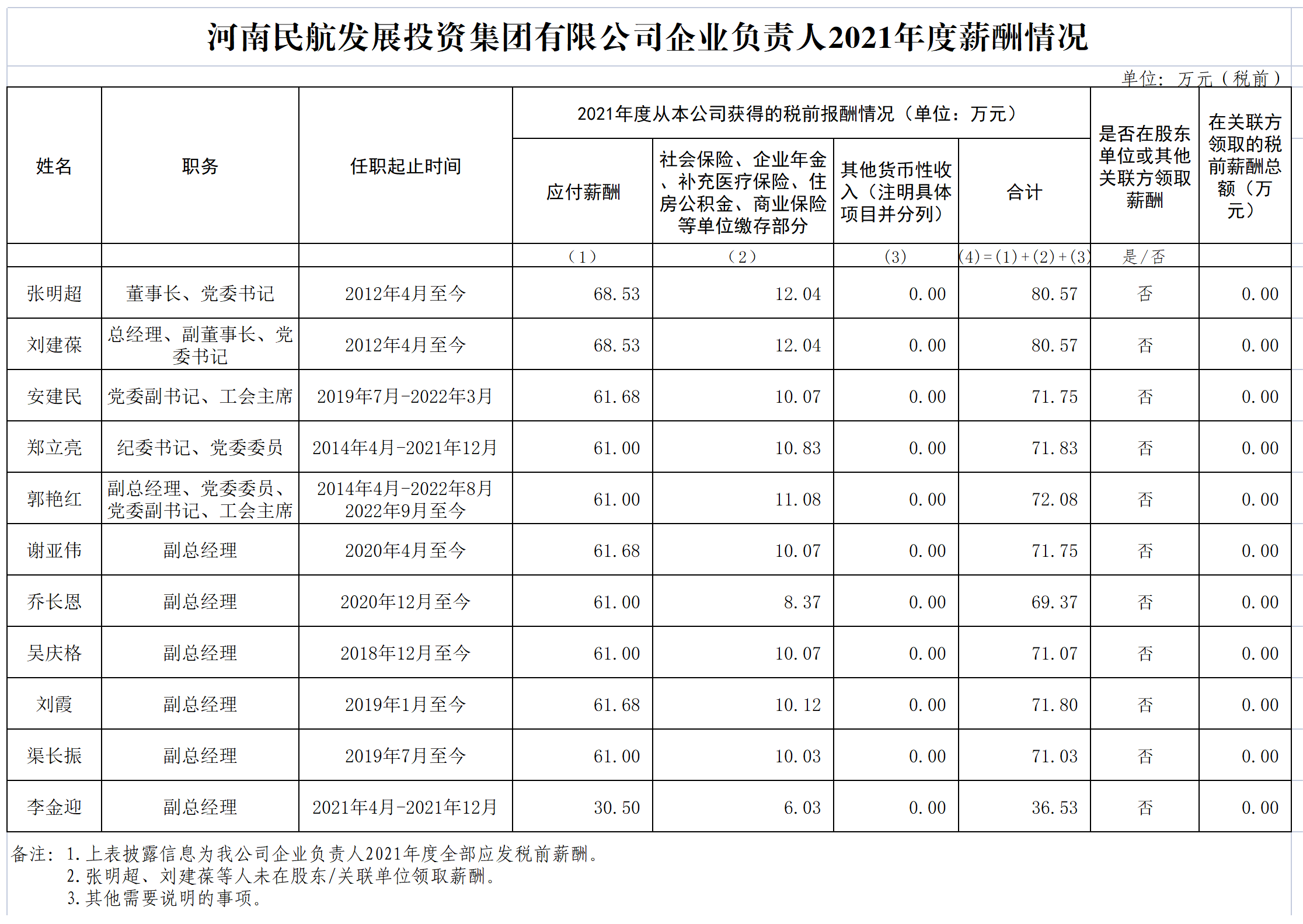 河南民航發展投資集團有限公司企業負責人2021年度薪酬情況