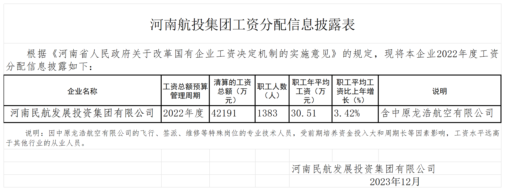 2022河南航投工資分配信息披露
