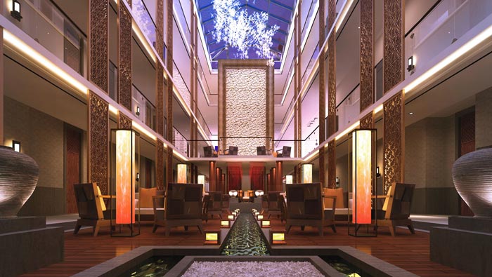 大廳的設計:顧客進入大廳之后,給人的第一感覺就是小溪流入百姓家的感覺,酒店的整體格局是回字形建筑,故此設計師在設計中,就充分發揮建筑本身的優勢,頂部銀河般的燈帶仿佛彩云一般,上頂彩云、下有小溪,給人營造一個生態化的自然氛圍。