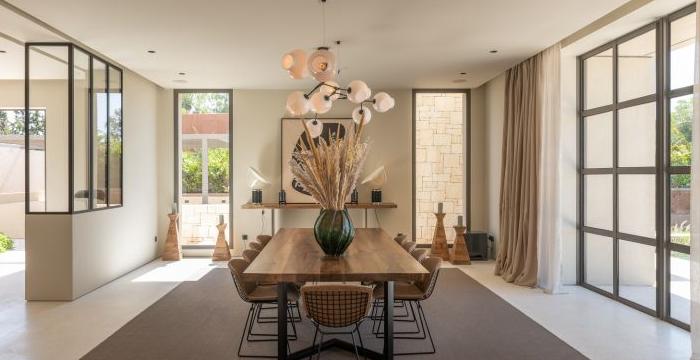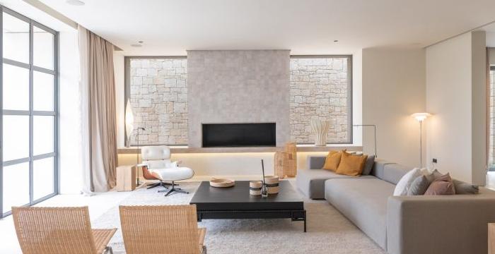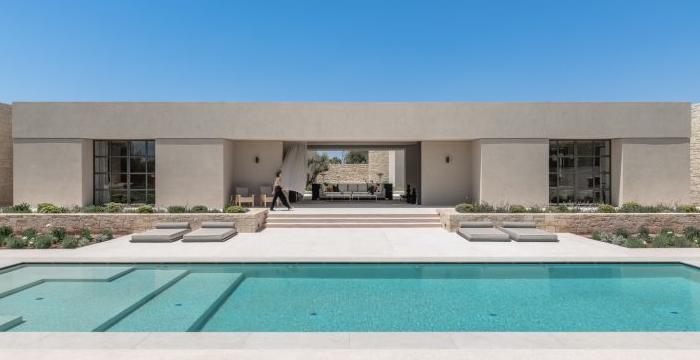 一間現(xiàn)代簡(jiǎn)約別墅裝修設(shè)計(jì)案例,空間面積600平方米。它有4間臥室和4間浴室,一間餐廳,一間電視房,一間接待室,一間廚房,一間辦公室。