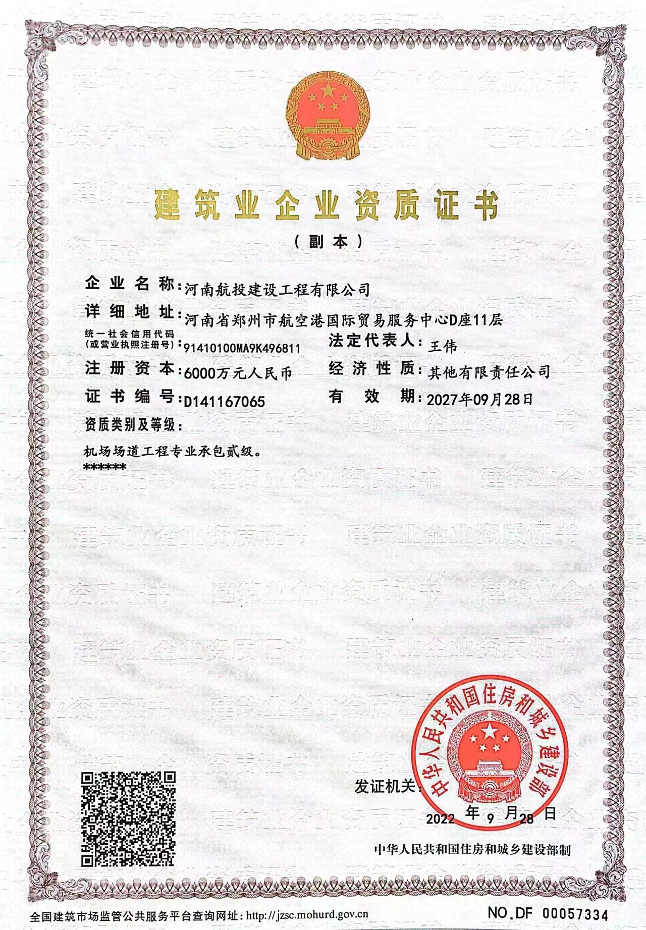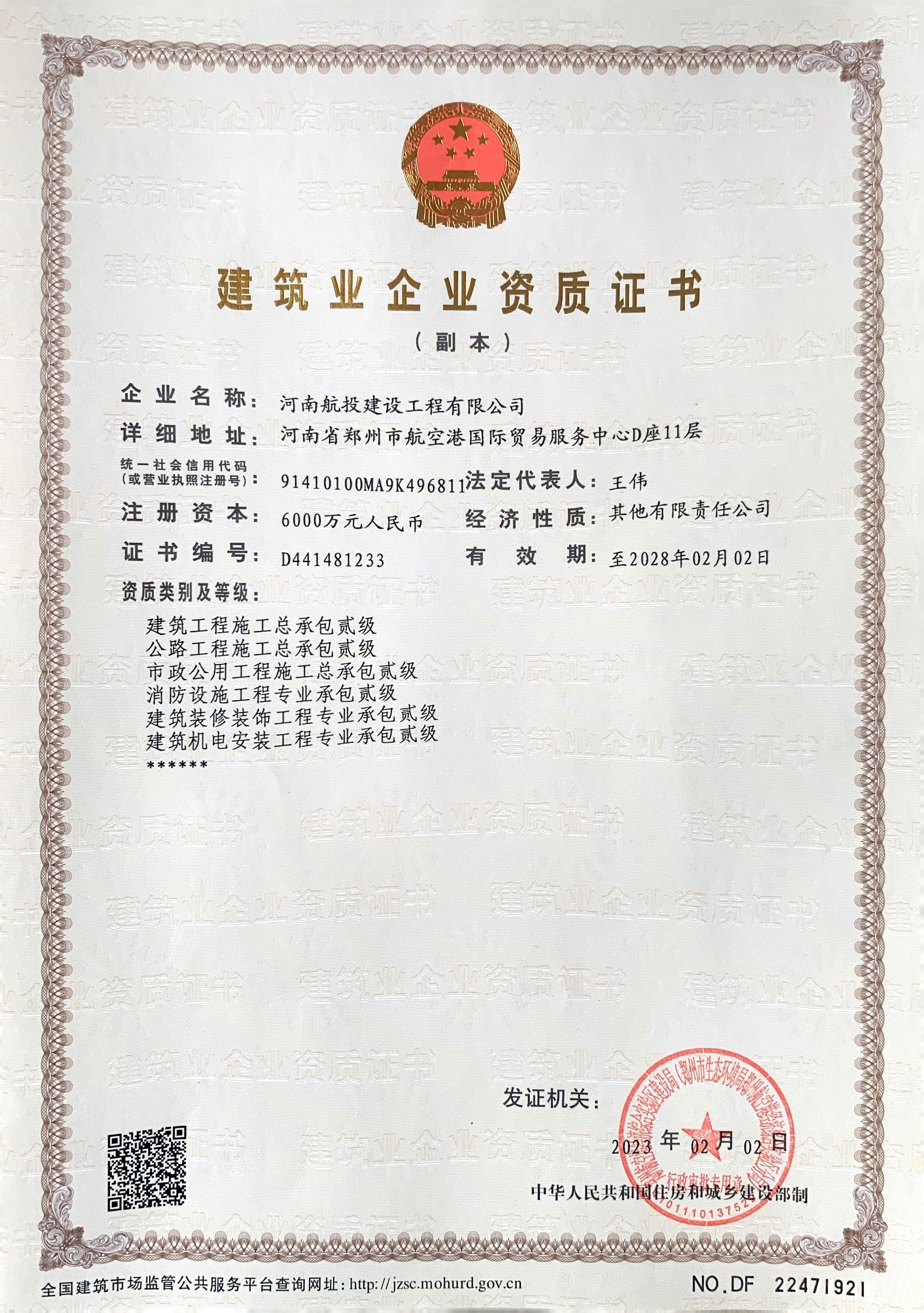 隨著新資質的取得,航投建工成為河南省第一家以機場場道工程、民航空管及機場弱電系統工程、目視助航工程為主業,同時配套拓展市政公用、公路、房屋建筑、鋼結構工程等施工領域的專業化國有施工企業。
