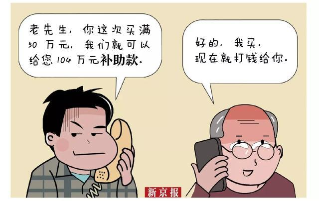 案例:70歲的劉某接到一個(gè)“保健專家”的電話,經(jīng)忽悠,劉某買了一萬(wàn)多元的保健品。然而,對(duì)方又稱只要購(gòu)滿50萬(wàn)元,即可獲得補(bǔ)助款104萬(wàn)元。當(dāng)劉某真的購(gòu)買了遠(yuǎn)超50萬(wàn)元的保健品后,那個(gè)從未謀面的專家再也聯(lián)系不上了。