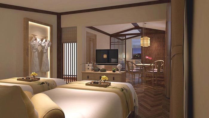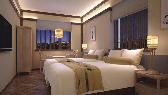 雙人客房的設計:此處給我們的第一感覺就是清靜,這也是正是設計師希望給我們的感覺,在設計師看來靜是動的必要過程,在現在社會中所有人都在動,但是我們卻失去了靜的機會,設計師希望在這里讓顧客尋回心安,在心安中體會靜的深意。