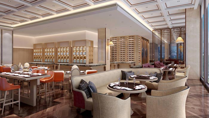 餐廳的設計:足不出戶是酒店給人的第一感受,在這里就是希望形成一個良好的內部循環,讓客戶在內部體驗到所有需要的服務,在這里設計師以家對餐廳進行定義,在設計師看來現在社會最缺的就是一種氛圍,一種家的氛圍,設計師希望客戶在這里可以體會到家的感覺。