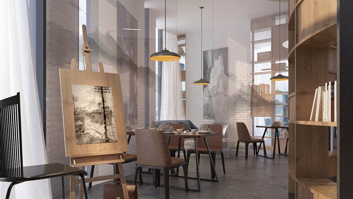 咖啡廳過道裝修設(shè)計(jì):過道在這里不僅起到連接的作用,同時(shí)設(shè)計(jì)師也賦予了其接待、休息的屬性,桌椅擺放在過道的外緣,以此滿足客戶在空間中的休息與閱讀。
