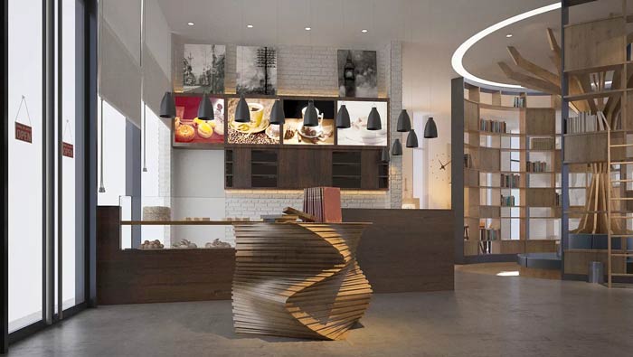 咖啡廳前臺(tái)裝修設(shè)計(jì):異形吧臺(tái)、展示柜、展示牌、燈飾構(gòu)成整個(gè)前臺(tái)空間,客戶進(jìn)入后在這里可以選擇自己喜歡的飲料,在展示柜可以挑選自己喜歡的甜食,簡單、明了是第一原則。