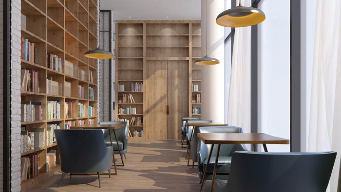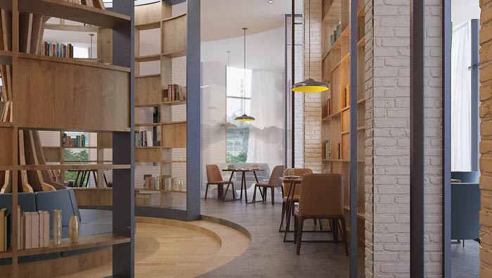 咖啡廳閱讀室裝修設(shè)計(jì):兩個(gè)半圓圍繞而成的閱讀區(qū)域,兩個(gè)半圓以圖書架的方式出現(xiàn),既起到阻隔空間的作用,同時(shí)也起到擺放書籍的作用,客戶在這里可以享受到暫時(shí)的寧靜。