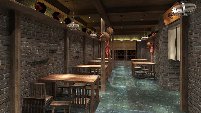 特色燒烤店墻畫設計:墻畫是以山水畫為背景,這樣做是為了將自然很好的融入室內,山巒起伏讓客戶仿佛置身于小村莊一樣,讓客戶享受到不一樣的生活方式。