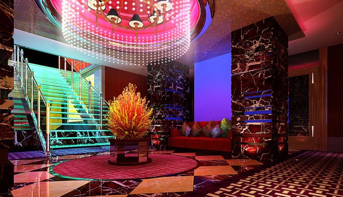 強調(diào)視覺中心等燈光具有裝飾KTV建筑室內(nèi)空間的作用,創(chuàng)造環(huán)境空間的形與色,使之融為一體,借助各種光效應(yīng)而產(chǎn)生美的韻律!