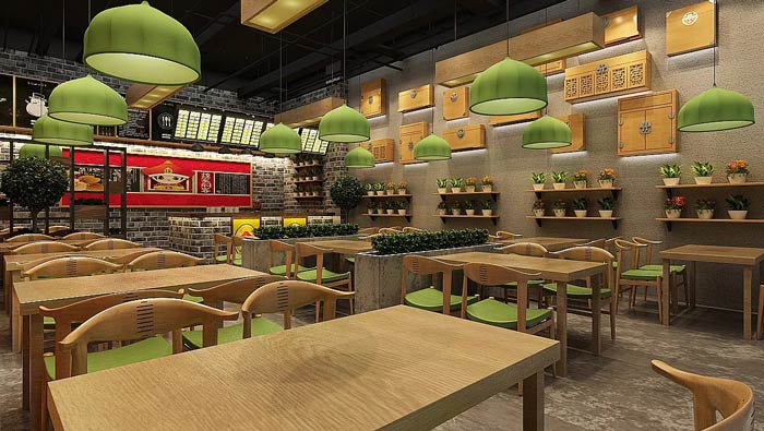 中式快餐店燈飾設計:綠色的燈罩、綠色的綠植、綠色的餐椅,一切的綠色設計是希望給客戶一種綠色的概念,這里的食物都是綠色無污染的,讓客戶在這里吃的放心、吃的安心。