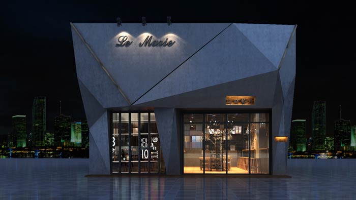 特色快餐店外立面裝修設計:異形的快餐廳外立面+銀灰色的色彩設計,讓快餐廳符合商業廣場內的氣質,這樣的設計讓客戶愿意進入,設計師要做的就是將設計與周圍融為一體。