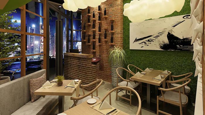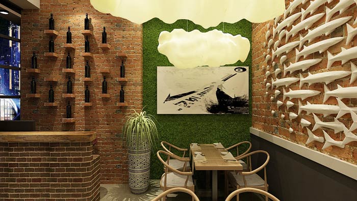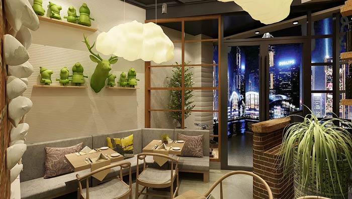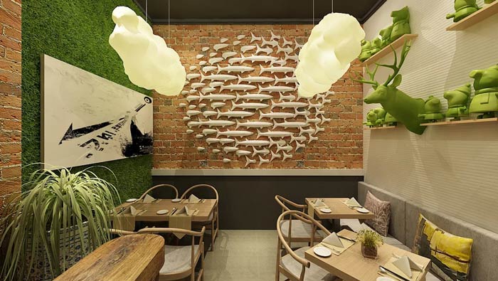 特色面館餐區(qū)裝修設(shè)計(jì):這里有魚兒、鹿等動物,有綠植、綠色植物墻等植物,還有云狀的燈光,三者相連構(gòu)成一個動靜結(jié)合的空間,在這里整個空間宛若自成一體。