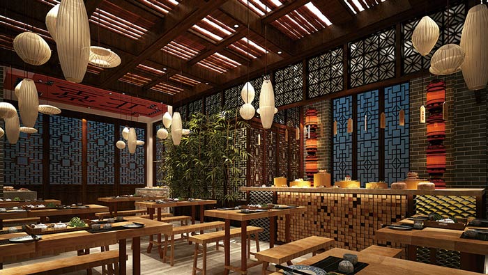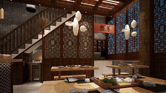 中式面館吧臺裝修設(shè)計:客戶進(jìn)入到面館之后,好似回到了過去,回到了幾百年以前,這讓客戶有一種穿越之感,這里的時間也好似慢了下來,讓客戶享受這難得的平靜。