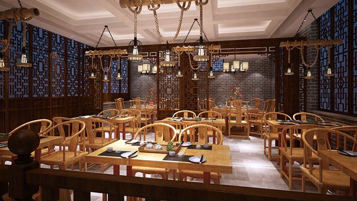 中式面館包廂裝修設(shè)計:圓形的桌子取周到之意,預(yù)示著面館周到的服務(wù),椅子按照八方的方位進(jìn)行擺放,即符合風(fēng)水,也符合用餐需求,同時也為客戶預(yù)留了足夠的活動空間。