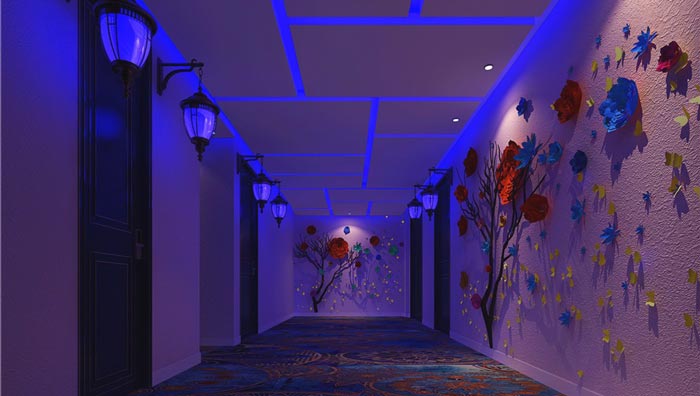 過道的設計:此次給人的第一感覺就好似夢境,仿佛我們都置身在夢境之中,在夢境之中我們往往會見到很多現實中見不到的事物,這也是設計師希望給大家的感受,以此讓大家產生期待,為后面的體驗埋下伏筆,讓客戶在期待之中去體悟其中的美好。