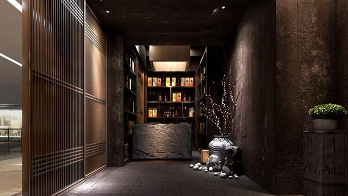 日式料理餐廳進門區設計:禪意、中式、日式三者相互交織在一起,這里給客戶的第一感覺就是心靈的舒適,這也是設計師希望看到的,設計師希望給客戶營造一個舒適的就餐環境。