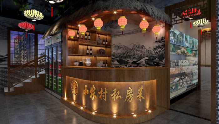 農(nóng)家私房菜進(jìn)門區(qū)設(shè)計(jì):小農(nóng)村私房菜,六個(gè)字給客戶以直觀的感受,鄉(xiāng)村樣式的柜臺(tái)、加上中式的元素,讓時(shí)間在這里慢了下來(lái),讓客戶享受美食真正的味道。