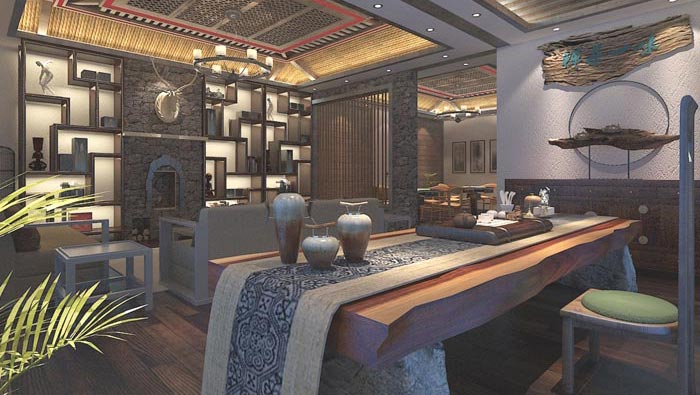 前臺的設(shè)計:當(dāng)顧客進(jìn)入空間之后,仿佛進(jìn)入到一個茶室,同時中式的裝飾引入我們的眼簾,中式是中華文化的延伸,在這里顧客感受到的是博大精深的中華文化,這樣的環(huán)境可以讓人的心慢慢的放松下來,在這里沒有繁雜的社會、沒有快速的生活、沒有吵雜的環(huán)境,有的只是安靜的氛圍,讓我們感受到生命的美好。