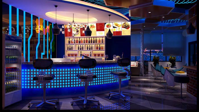 地面個性的地面拼花放射性的效果和吧臺融為一體,暗藍色的肌理漆,很好的鋪墊了大環境,木紋的裝飾個性爾舒適,設計的基本原則是少花錢出效果。