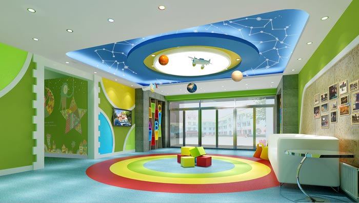 前臺大廳的設計:陽光透過大門射入室內,讓人感覺到溫馨與溫暖,設計師希望陽光可以無處不在,讓孩子在這樣的環(huán)境下可以健康、快樂的成長,在其中設計師采用了陽光、色彩之間的相互交融,設計師希望展現(xiàn)在孩子面前的是一個五顏六色的世界。