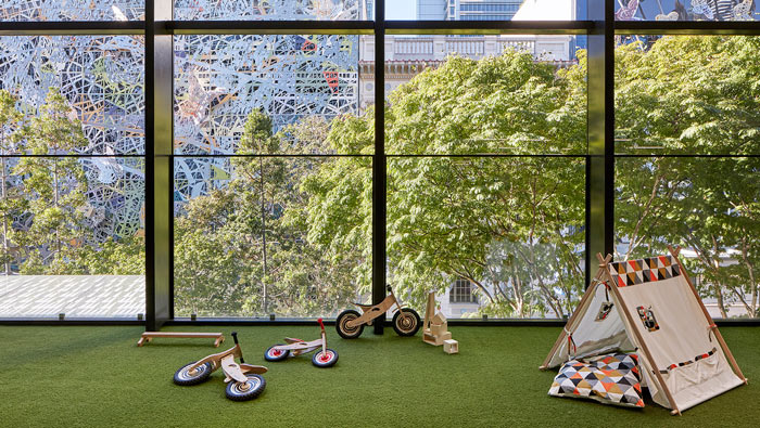 早教中心休息區(qū)設計:孩子都愛赤腳走路,故此設計師在休息區(qū)的設計中,沒有設置座椅,只是將草坪安置在其中,孩子在其中赤腳坐在那里休息,帳篷讓孩子在自然中休息。