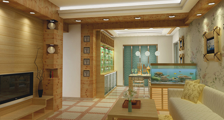 基調是豐收的金黃色,盡可能選用木、石、藤、竹、織物等天然材料裝飾。軟裝飾上常有藤制品,有綠色盆栽、瓷器、陶器等擺設。