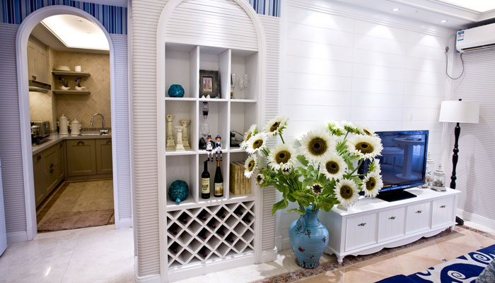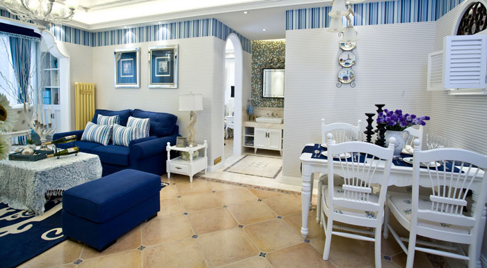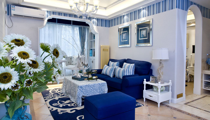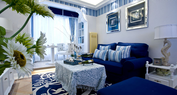 多以藍白色調為主,空間布置中加入海洋類裝飾物件,如帆船貝殼之類,地中海風格客廳中條紋沙發占有主要點綴作用。