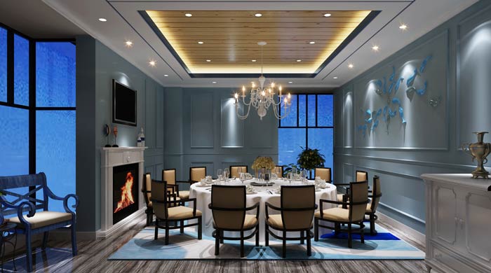 主題餐廳包廂設(shè)計(jì):這里給人的第一感覺就是安靜、舒適,在嘈雜的都市中,一個(gè)安靜的就餐環(huán)境成為難事,在這里設(shè)計(jì)師借助海洋的寧靜,打造安靜、舒適的空間環(huán)境。