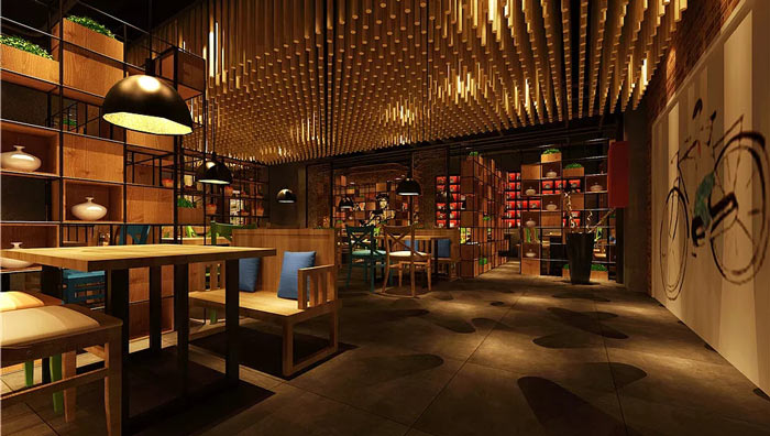 主題餐廳裝修設計:多根木條組成的天花吊頂極為壯觀,由不規則的木材特制的空間隔斷也極具新意,給人以強烈的視覺沖擊。