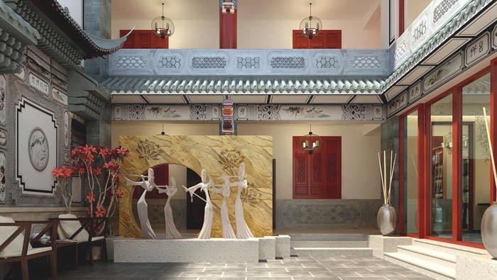 酒店進門區域的設計:此處在設計中融入了白族的文化內涵,目的就是希望讓客戶感受到歷史的傳承,在現在人心浮躁的今天,設計師很希望讓大家可以靜下心來聆聽歷史,在歷史中尋找那難得的清靜,不管是瓦礫還是彈琴奏樂的場景,都讓人有種回到古時的感覺,讓人去體會那莊公夢蝶的體會。