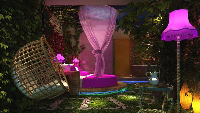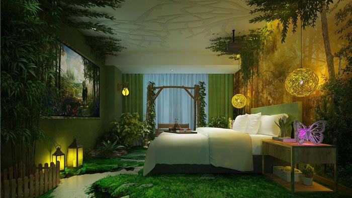 世外桃源客房的設計:一眼望去此處有我們想象中的世外桃源重合在一起,這也正是設計師希望給我們的感覺,在設計師看來,我們雖然生活在科技發達的時代,但是弊端與優勢更加明顯,人與人之間更加淡漠,情侶之間雖然在一起,但是手機綁定了我們的眼睛,讓我們看不到彼此,設計師希望讓情侶們放下手機,去擁有那美滿的生活。