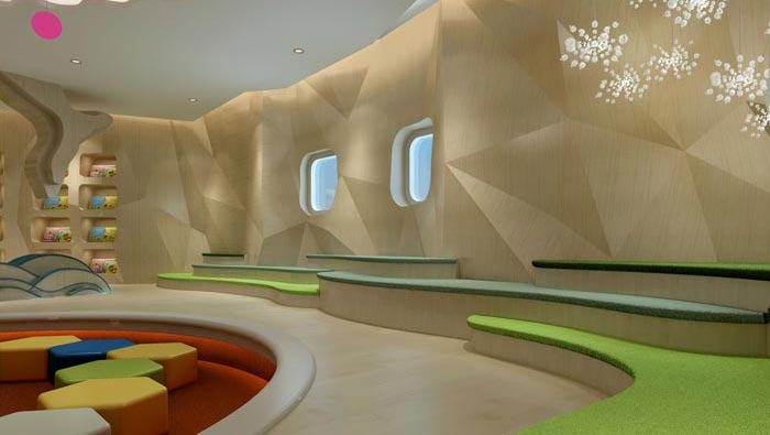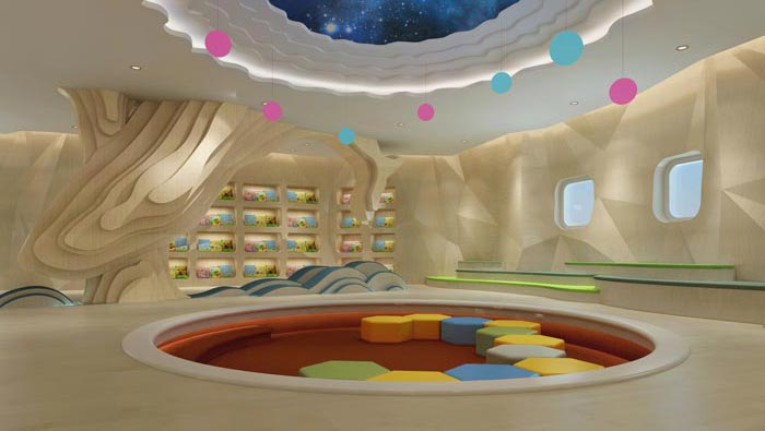 閱讀池的設計:此處位于空間的正中央,整個閱讀池或坐或躺,既可以滿足孩子的閱讀,也可以讓孩子在此處玩耍,同時保證孩子的安全,階梯狀的座椅讓孩子可上可下,可以鍛煉孩子的獨立自主,同時此處可以欣賞到整個空間的景色,在此處本身就是一種享受。